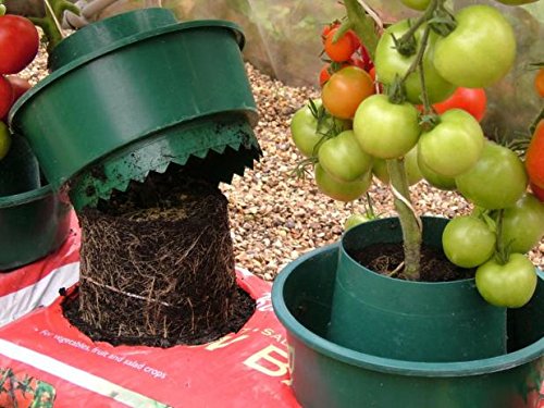 Gus re: the "double pots" the added height of the inner pot gives more rootspace whilst the outer pot has holes in the base and it's into this space the water/feed goes once a week without wetting the plant stem and leaves (reducing possible disease and blight) , normal water is drawn from the base reservoir via capilliary fabric into the underside of the grow bags. This means the toms have a steady water suppy and can go up to 3 days without the need to re-water.