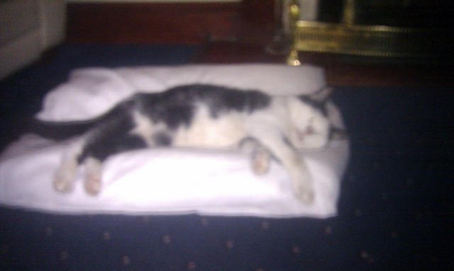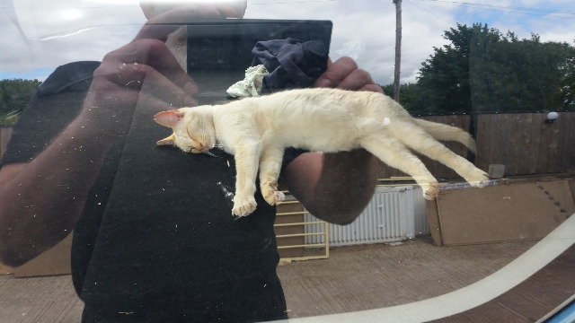 Puss mk1....a lovely stinky old cat.....very pleasant....and very odorous.... so after a month or so we decided he could stay....the only cost being...his nuts.....anyhoo....when examined by the vet and furthermore x-rayed it transpired he had no teeth worth having and a broken pelvis.....so he was taken home and we loved the snot out of him for a fortnight...then had him euthanased....he was a cracking old boy even though you had to change your clothes and have a deep clean after handling him.....he was so incapacitated by his condition he used to claw his way up the furniture to be with you...he was great so long as you could grab him and lift him up! I really miss him!!