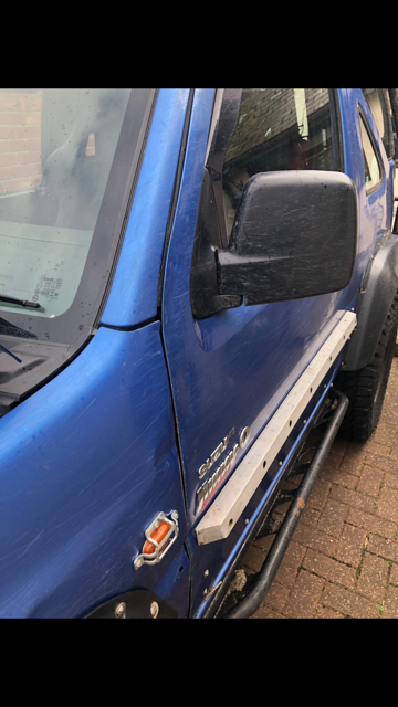 On my last trip out with 'our little group' something in the shubbery had ripped Brett's passenger-side mirror of:( I was "luckier" that it had a go at my door rather than the mirrorand pushed the wing in (again!),so out came the lump hammer and a pry bar! -
