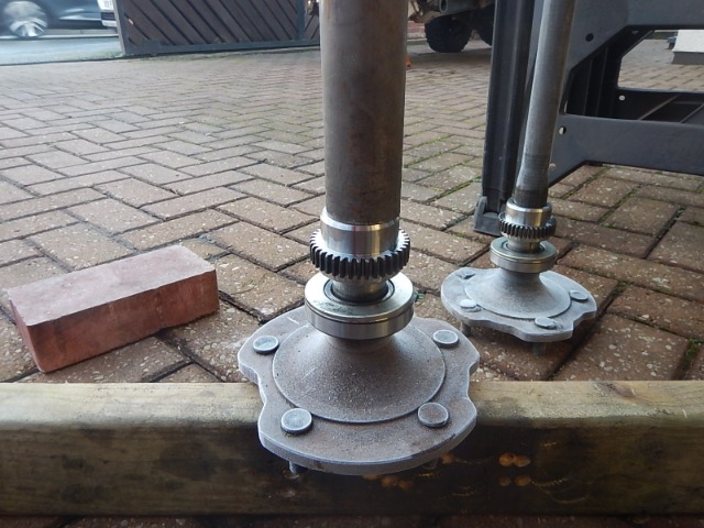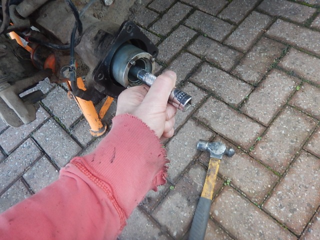 Tapped it into position under the ABS collar's cogged bit... Applied loads of heat, balanced the tool on two bricks, and with a 3"x2" timber offcut on the end of the shaft, banged and banged... :lol:
