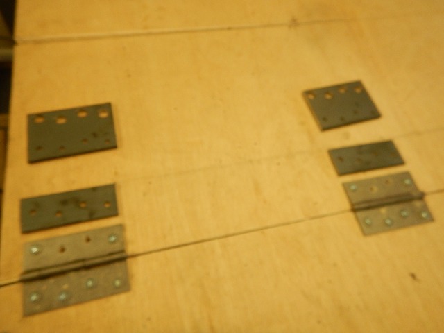 Whoops, poor photo, but made some strengthening plates to go under the hinges of the 'box' in the boot, and as the second 'fold' will have the hinges underneath - although the panels will butt together - I wanted to add more strength to the join as my Labradors are indeed of the chunky variety, so the top plates will close over the top of where the hinges are underneath and brace it all up (as shown in the sketch at the top of this post)... The big holes are to go over the nyloc nuts holding the other side of the hinge on...