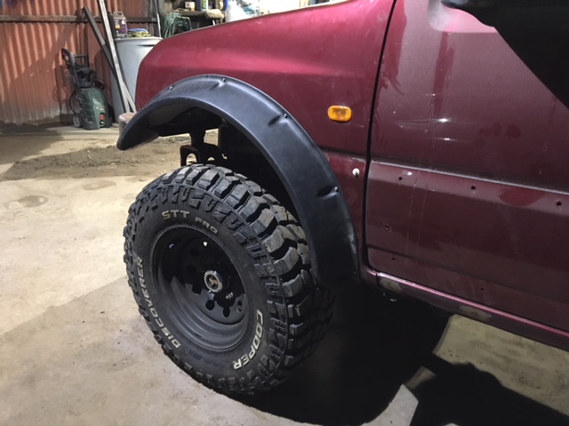 Now that ive got it back in and bolted up with a new clutch, the rocklobster box from TomDK went in (5.14 ratio and a spine'd cradle). On with the Cooper's on 15x8's and 30mm spacers for a test fit. Trim up the (again cast off's) arches which came from James Priestly, but are the ones Kiethy was making, rejects apparently.