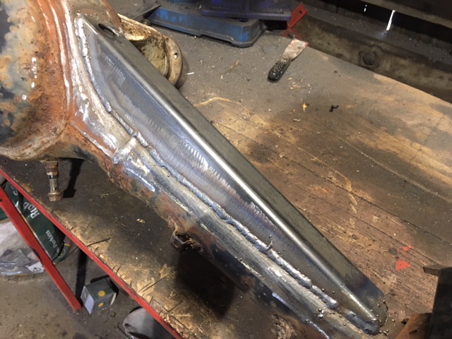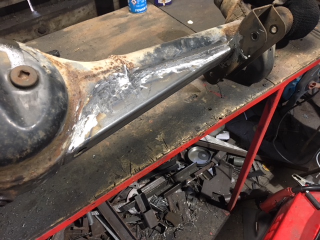 The correct word for the brace fitted. Its basically a bit of heavy 50mm box steel sliced long ways to fit onto the axle at an angle. Its job is to brace over the weld on the longer section from the diff housing. This is the known weak bit on a jimny axle (apart from bearings). So cut and weld. Welding coming along pretty well...