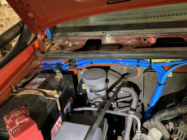 I had tapped threads into the axles and t-box when they were off, and the gearbox just needed extended. Pipes tie wrapped under the car with some loops for movement and routed up to the battery area. Smaller airlines are for the ARB air locking diffs.