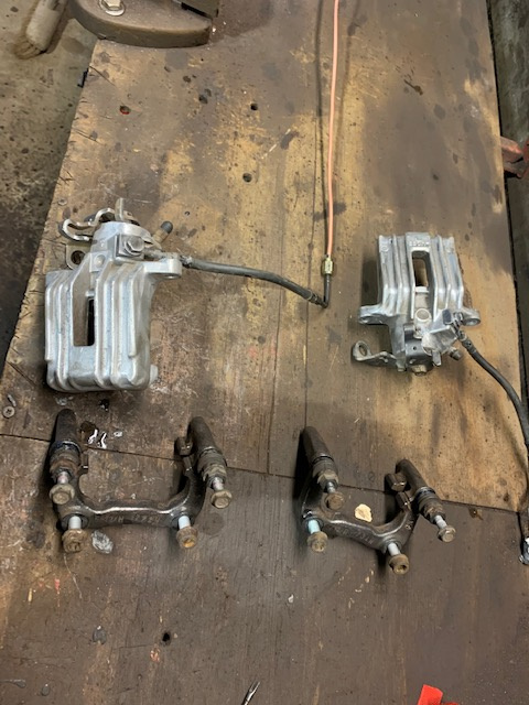 Trip to the scrapyard today to get some brake calipers and brackets from a VAG car. Was told MK4 golf, but actually got them from a skoda octavia (identical part). Right old fight to get them off as they are an allen key style bolt that holds the hangar onto the axles. Got them with a bit of the solid pipe still attached to allow me to try and use the flaring tool to join them to copper, which I can join to the existing splitter block on the axle pretty easily...