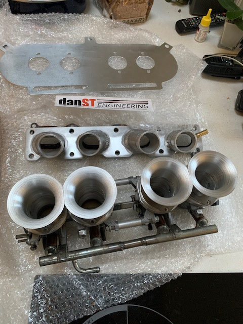 DanST have come up with the goods. Turned up today just as I was getting home. A fair few bits to it. The throttle bodies and trumpets above, manifold and airbox too. Lots of little bits to make it all go together as well. Looks pretty well made too.