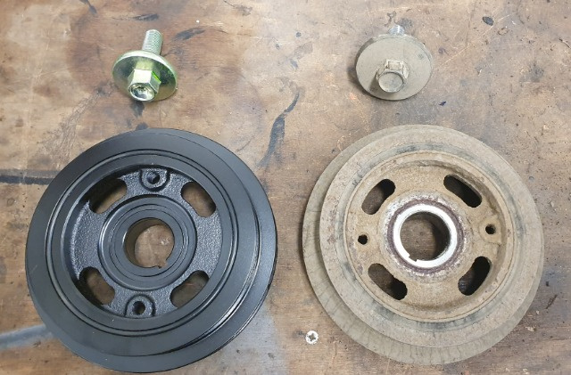 Old v new pulley (fitted a new crank bolt from bigjimny shop). New tensioner bearing pressed in (also from bigjimny shop).