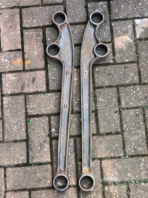 Old rubber bushes removed (lovely job... NOT!) and radius arms wire brushed and ready for paint...