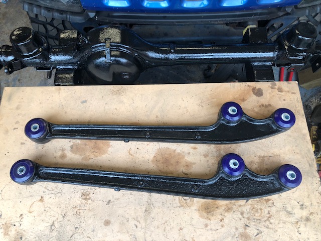 Painted the radius arms and the axle casing twice, then fitted the SuperPro poly bushes into the radius arms, and then fitted them to the axle casing -