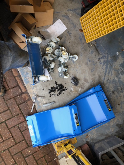 Only trouble was that they came needing assembly! 16 castor wheels to bolt on! So after a lie-in, walked the dogs, and a cooked brekkie (of course!) I started tidying the garage after the blue Jimny had been hastily emptied as it sold quicker than I thought, and the dollies were eventually assembled...