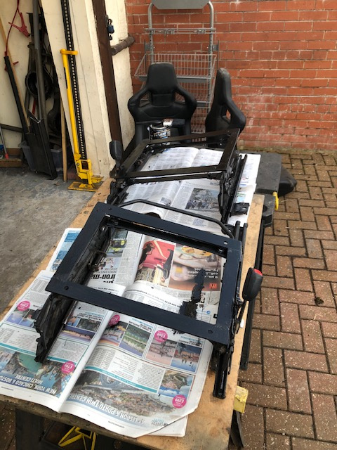 A little bit of work on them first, as where the original seat belt anchroages were on the subframes were in the way of the seats fitting properly... so I cut the mounts ff flush with the rails, and then drilled a new hole lower down on the rail and used some seamless tube as a spacer to get the seatbelt clips further out, and bolted them on with 12mm bolts washers and nylocs.. and then painted them...