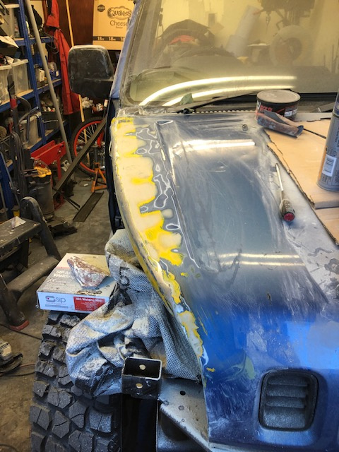 Being as the filler was out, I also fixed the welding warps in the outer skin of the bonnet and then work down the grades of sandpaper until final finishing with 'wet-n-dry'...