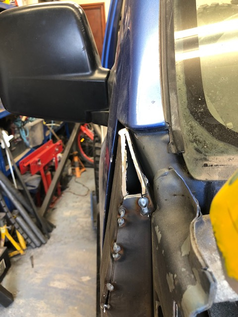 Mock-up with some slightly smaller box offcut that was lying around... Sp the two box sections will meet here, and the tube down from the roofline halo hoop will run down the windscreen's a-pillar and land on the box section with a strengthening gusset welded to (what's left of) the inner wing...