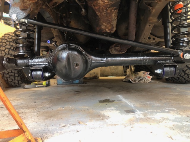 Painted the radius arms and the axle casing twice, then fitted the SuperPro poly bushes into the radius arms, and then fitted them to the axle casing -