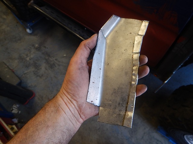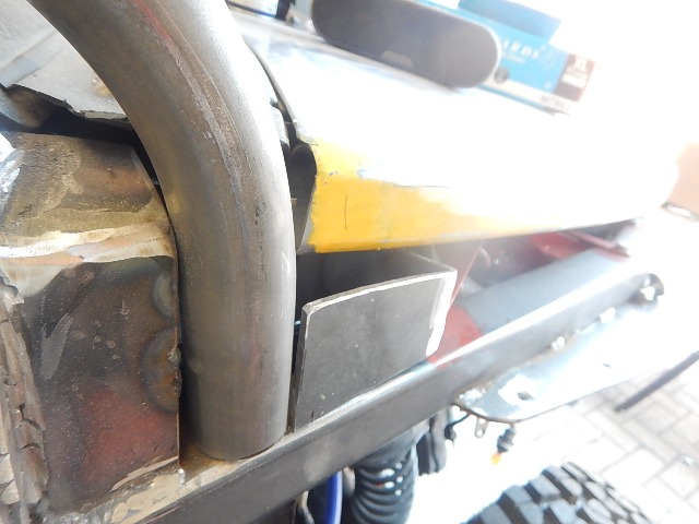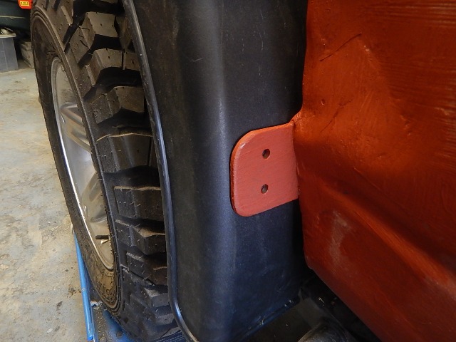 ... another at the rear off the bottom box section part of the rear body tub... that's a small length of L-shaped edging, so it's supporting the arch from underneath too, couple of bolts and large repair washers behind should stop those pesk trees from stealing it?