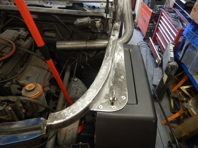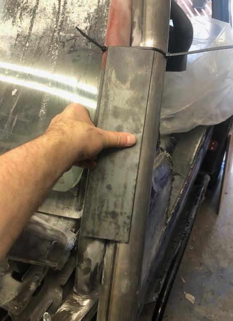 On the A-pillar I'm planning on rounding the corners of this steel plate and welding it along the right hand edge to the snorkel tube... on the left side I'll drill three holes through the plate, and then drill through these into the 'cage's A-pillar tube and then weld nuts into the A-pillar tube so that the snorkel can then be bolted to it... (I'll shape the plate a bit to make it look nicer too of course
