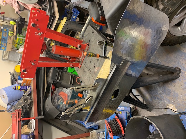 Back to the cardboard template for the door cards... test fitted, checked, made and fitted a bracket to hold the door handle, test fitted again... cut the aluminium chequer plate, test fitted it, drilled loads of holes in it, bent it using he same method as before, only the wife was working so her weight was replaced with the pipe bender on the other end of the bench :laugh: