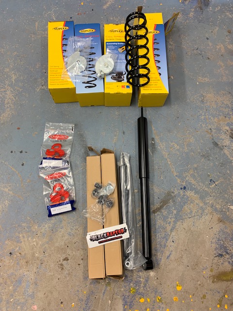 Four standard front springs, four looong shocks from Russ at JimnyBits, spring clamps for dislocating springs, and panhard rod bushes.. to be fitted once the panhard rods have been shortened and rewelded (?)... Ah, yes, I forgot that bit