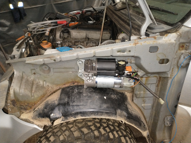 Well, It's been a while since I last posted an update. Over the summer the air compressor for the suspension seized and the Jimny got left in the naughty corner for quite some time. Just before Christmas I got some spare time and started getting the Jimny back up and running. I think the compressor over heated. The engine bay was just too hot for it. After spending a lot of time scratching my head trying to find an alternative location for the pump I ended up installing it under the left hand wing. This time I'm using a BMW suspension pump. It is not as fast as the previous pump but it's better quality and small enough to squeeze into the available space. These BMW suspension pumps are pretty reliable and second hand ones are really cheap on eBay.
