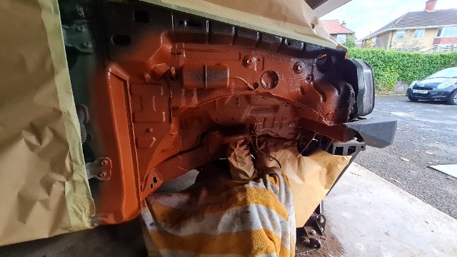 Today I scrubbed up the driver's side wheel arch and inner wing. There are no inner-wing covers until I make my own, so I got the WAR buzzweld paint out and lathered it.