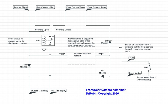 When I come out of reverse, the NE555 activates the front camera and provides 12V to the Xtrons reverse camera input. Since the relay now drops out the AV signal from the front camera is fed to the Xtrons unit and it displays the front camera. After 5 seconds or so the NE555 times out and the front camera goes off, the Xtrons display goes back to normal.