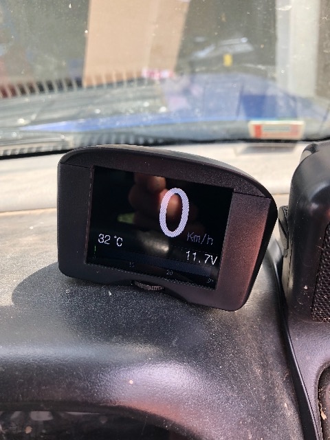 With the Jimny resting on the drive, 0 km/h*, 32 degrees ambient water temperature in the radiator and 11.7V coming out of the battery with the engine not running...
