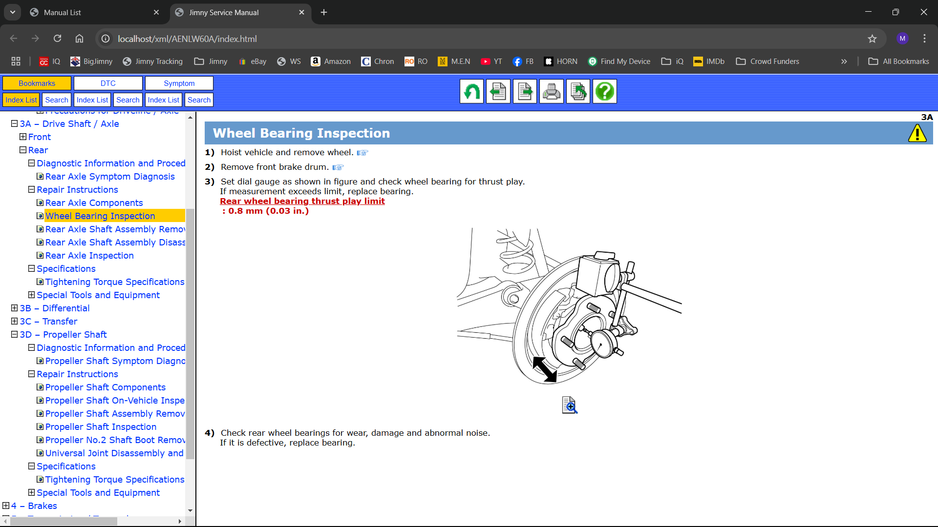 The sound when turning could be the normal noise of the differential; however, there is another type of noise that seems to come from the outer rear bearing. What I’m going to say applies only to the third-generation Jimny; I don’t know if it’s the same for the fourth generation:Check if, when hitting the wheel, it feels loose or makes a lot of noise—this indicates a worn-out bearing. Try pulling and pushing the wheel firmly with your hands; it should not feel loose. If there is any looseness, it should be minimal and barely noticeable.The rear bearing system in the Jimny is very basic and poorly designed. If you replace the bearing, make sure it's the original one, as manufacturers do not produce spare parts with the same quality as those sold to car assemblers.The free play mentioned in the manual is almost impossible to find in a Jimny that does not have less than that tolerance, especially in Jimnys with over 150,000 km or those where the original replacement part was not used. A low-quality bearing can last between 5,000 km and 30,000 km, while the original lasts longer.Why does it wear out so quickly?