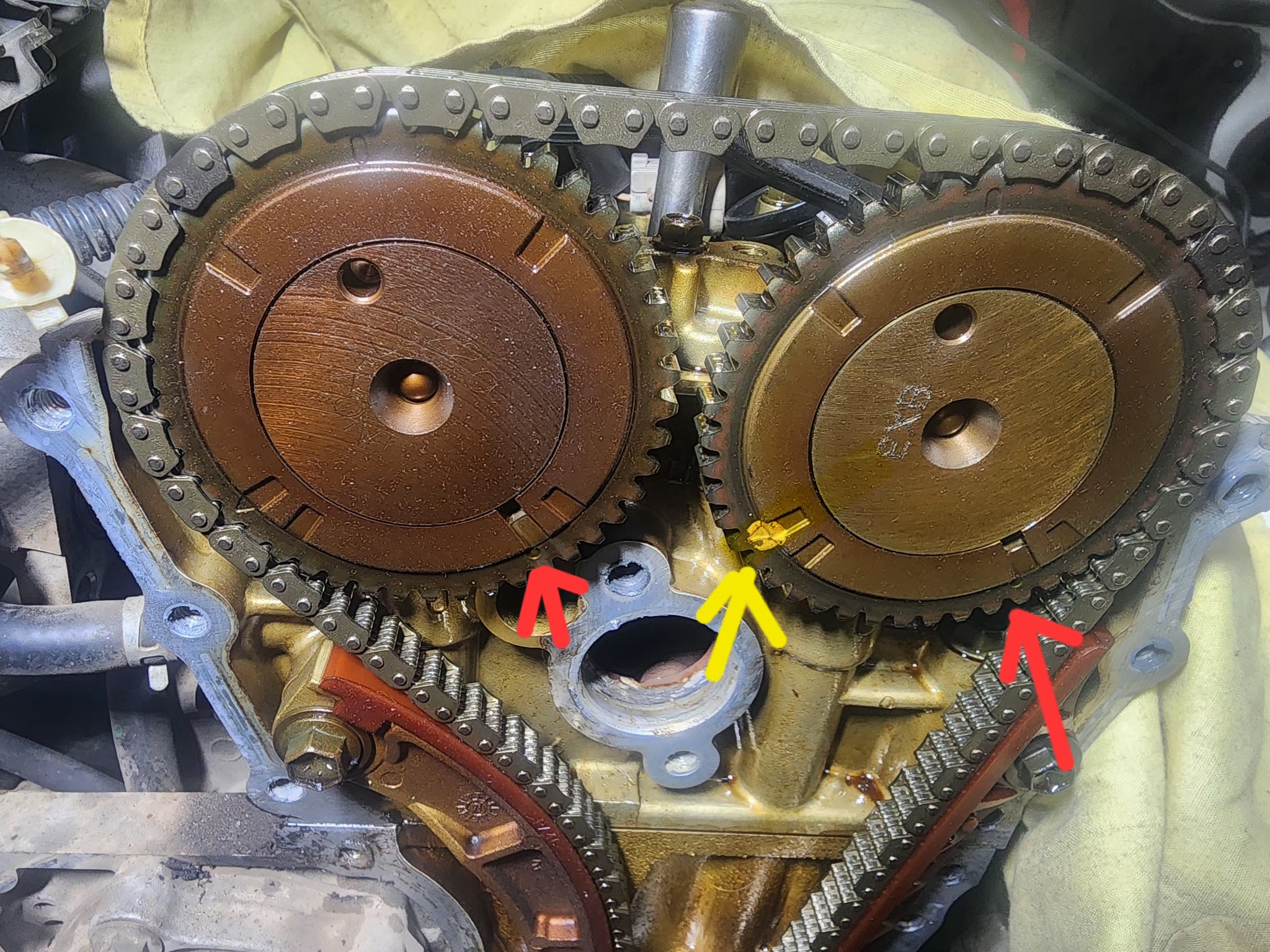 In the attached pic I believe on the compression stroke with crank drift upwards, the red arrows display dots on can sprockets, yellow highlight is painted arrow.