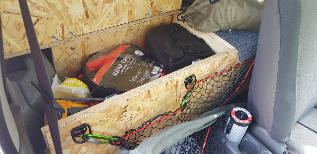 As seen, there are fasteners there for the cargo net. These two compartments are intended to store things I don't need normally, like tools. One compartment is for tools and such things. As of now I have one free compartment, that I might turn into a water container.