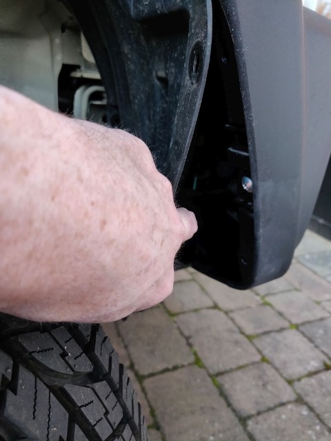 In order to get enough room to swap the bulbs, put the car on full lock towards the side you're working on. You then need to remove four push pins (red arrows) and one Philips screw (orange arrow) per side. Screw head is underneath the bumper.