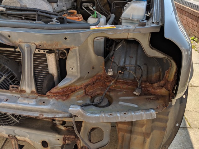 Took advantage of the good weather we had this weekend and thought I'd address the front body rust. Unfortunately I got a bit delayed by the original front bumper fixings. Can't for the life of me think why Suzuki decided to use Phillips head bolts. So after a few hours drilling them out with some left handed drill bits, I had the front bumper off. Next was the lights, after removing the two bolts, I gave them a good yank to remove the two retaining lugs. They ended up taking quite a bit of steel with them