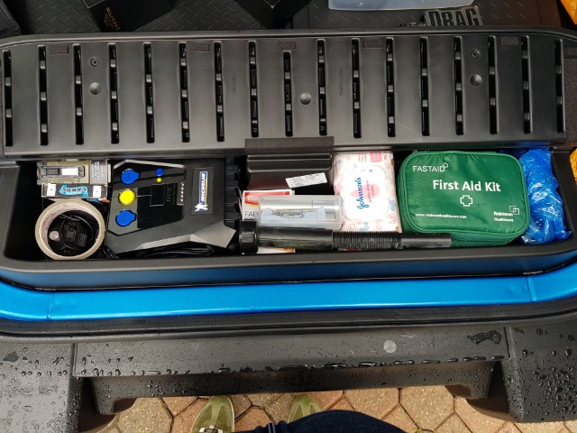 Some crucial (in my eyes) kit .... now loaded - x2 HAM radio's, Medi-kit, Tyre inflator, tyre pressure gauge, torque-wrench, Emergency strobe (yes over-kill is my style), Playing cards (why not), extra gain HAM antenna with roof mount, LED power torch (which reaches the moon on a good night), hand wipes, lighters, handy bags, gaffer tape (for my unsuspecting victims), mini saw, wheel bolts, compass and a glock 17
