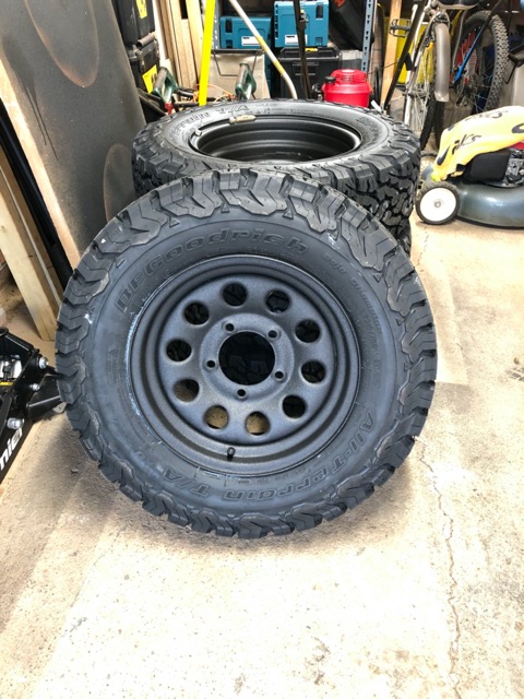Yes they're genuine 3rd Gen. Jimny steel wheels, finished in U-Pol Raptor black. Very tough, slightly textured finish.