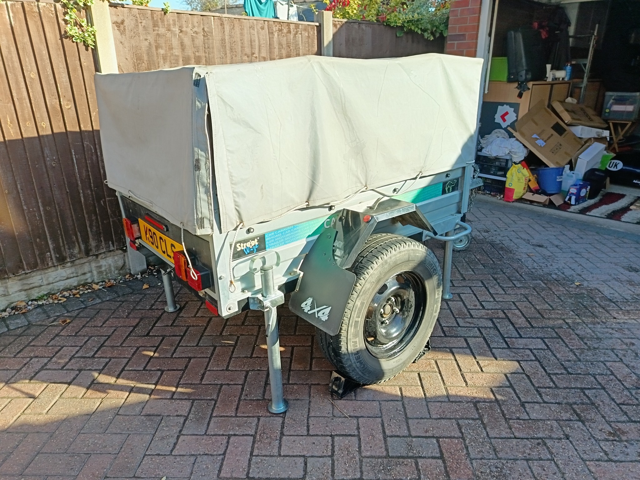 Lightweight Camping trailer. L5ft, W3. 5ft, H2. 5ft box. 215/70/15 tyres from a camper van, so not off road but do have thicker sidewall making them fine on the lanes. Lightweight, good condition. 2012 (I bought from original owner a couple of years ago). Has been kept in garage most of it's life, but has seen lanes with me. Just done 1,957 miles through France, tows great. Last couple of pics show how I had it set up, but now back to basic. Leaf spring suspension. New Electric cable and plug fitted when I bought it. Steady legs on each corner. Box on front only has 1 clip as broke one last week. Cover showing signs of age, and does have holes in top that will need patching where I had roof tent fitted. Collection from Doncaster. £595 or good offer.