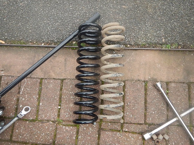 Ooh?! That's a surprise?! :ohmy: I'd figured the new springs would be a bit longer than the old ones and I'd have to cut a coil off the front and two off the back? But no, these are near as damn it the same length as the old ones (+3" front diesel springs from you-know-who). But these are wound even thicker, hence why I figure they'd be suitable for the weight of my notoriously heavy Jim' :lol: