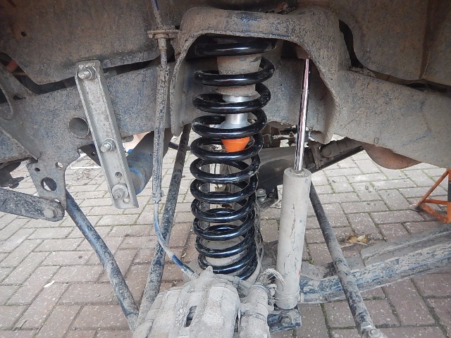Front springs in then, on the original spring seats I'd stored in the garage (i.e. no spring spacers up front this time) and an extended bump stop finally fitted into the front springs, again, this could also have contributed to the front springs sagging...
