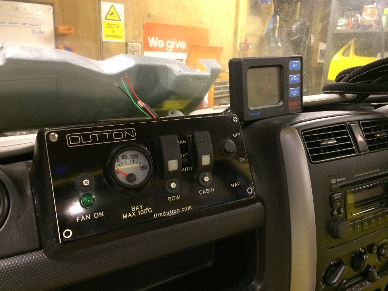 The additional control panel replaces the passenger side air bag. The control panel shows the engine bay temperature, cooling fan status lights, and controls the bilge pumps, navigations lights. The additional screen to the top right of the control panel is the depth finder. I've not decided on the final position yet but its something every 4x4 needs!