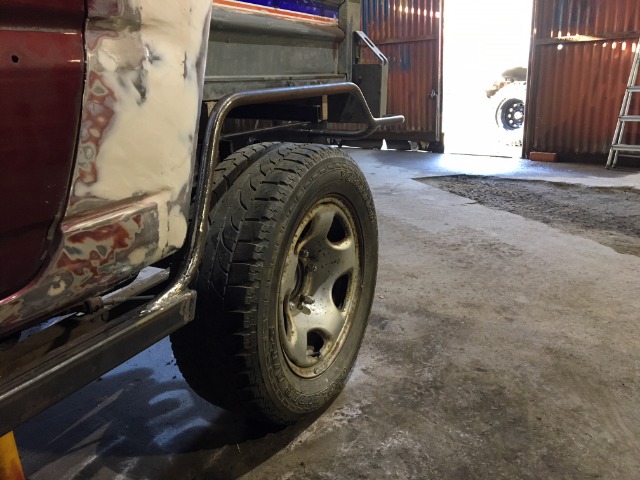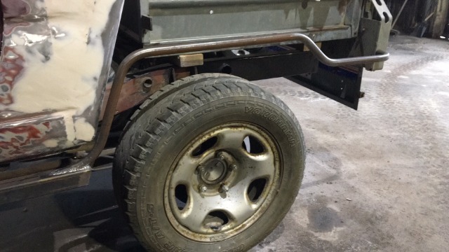 Had some 3/4" tube in stock so messed around with making some rear mud guard rails. Pretty happy with the results so far. Will mean theres a nice step behind the rear wheels (big enough for a 20L jerry can, although I dont think its legal to strap a can of petrol to the outside of the car in the UK).
