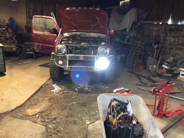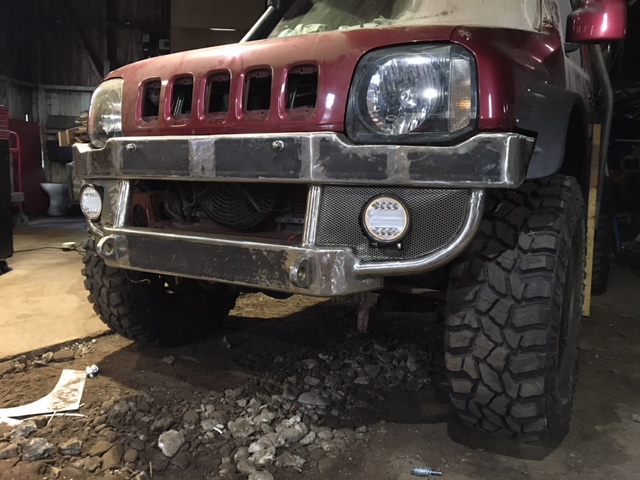 Got a couple of 2 function lights off amazon so have cut the mesh to let them poke through and welded on a little bracket for them to bolt to. Again, pretty pleased with them. very bright things.