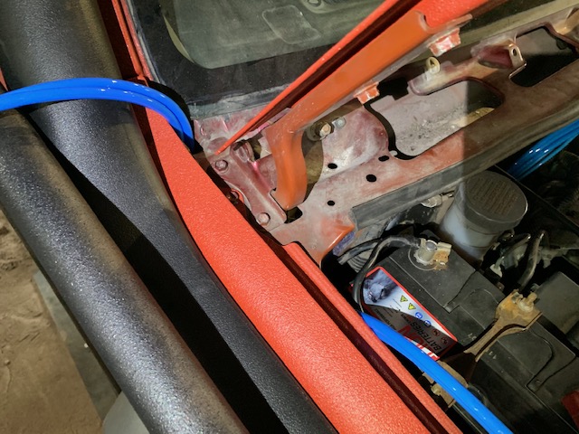 Joined the breathers together and took two pipes out to stick out of the plastic below the windscreen, then up the snorkel. Convenient drain used to get the pipes up through the scuttle panel...