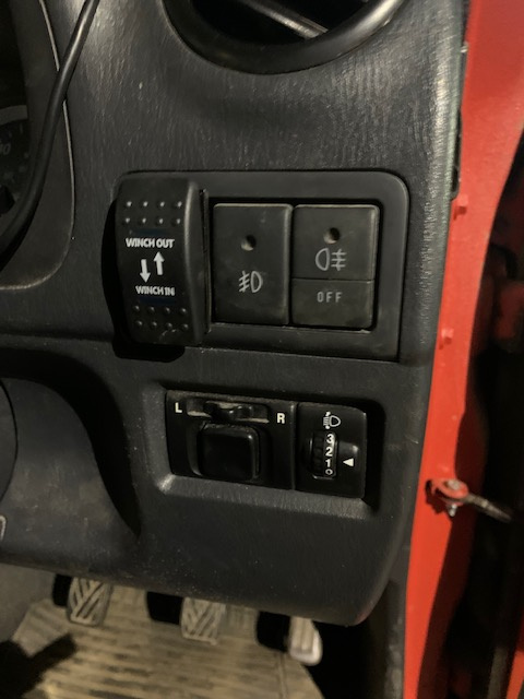 That sorted out the wrong stuff, next was the annoying winch controller. Its a winchmax one and came with a wireless remote that can also be plugged in (e.g. if battery goes flat). The reciever for the wireless part of it is not waterproof (so winchmax tell me). Its located within the solenoid box (the solenoid is waterproof at least). Obviously mine has got wet as it no longer works. Plugging in the lead is a bit of a pain as the solenoid box is under the bonnet, near the airbox. A cheap two position retractive switch was bought from amazon and wired into the dash blank beside the fog light switches.Fitted with a little filing to the inside edges It doesnt match in at all however, but works well for now: