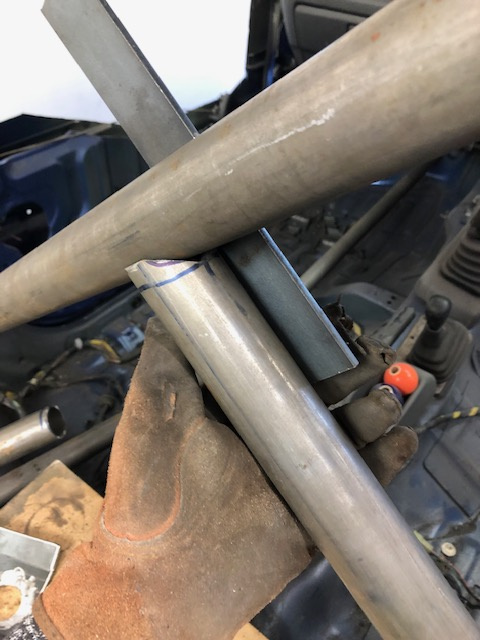 So the thicker tube of the 'X' butts up to the gusset place, and the smaller seamless tube is then hammered through the hole in the roof / hoop of the body into the bigger tube as it just passes through the hole in the gusset plate, I've also drilled four holes in the tops of the crossbars to puddle weld through to the smaller tube inside... once it's all welded up it should be super strong, and brace the weakened body due to back half being removed...