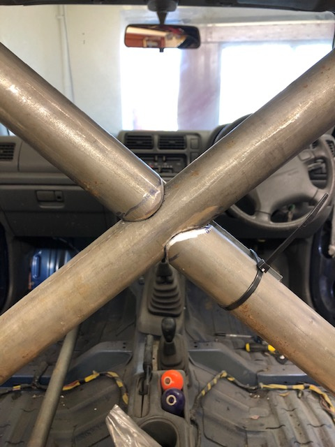 So the thicker tube of the 'X' butts up to the gusset place, and the smaller seamless tube is then hammered through the hole in the roof / hoop of the body into the bigger tube as it just passes through the hole in the gusset plate, I've also drilled four holes in the tops of the crossbars to puddle weld through to the smaller tube inside... once it's all welded up it should be super strong, and brace the weakened body due to back half being removed...