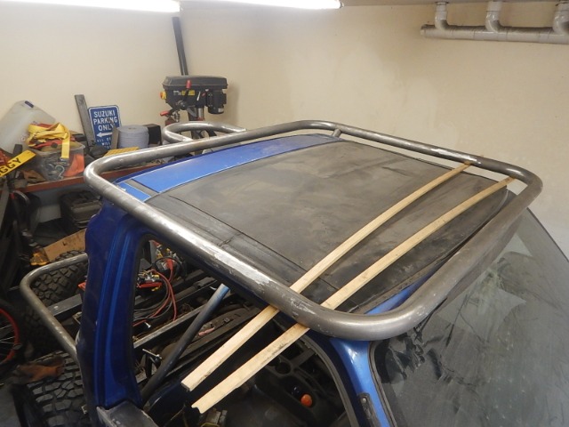 Pulled the front soft-top section back to test it fits nicely inside the roofline tree scraper and roof protection bars, and to bend the front mounts to suit... but time was ticking on by now, and the dogs needed a walk...