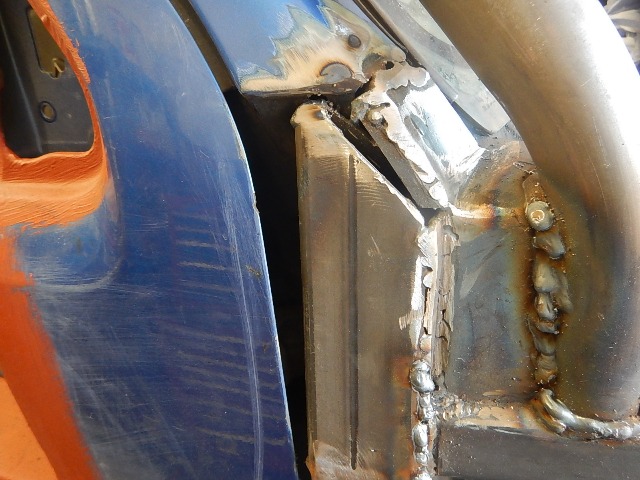... another at the rear off the bottom box section part of the rear body tub... that's a small length of L-shaped edging, so it's supporting the arch from underneath too, couple of bolts and large repair washers behind should stop those pesk trees from stealing it?
