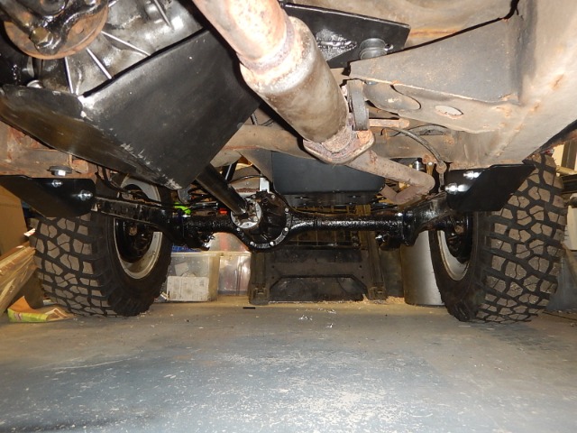 the front and rear axles have both been rebuilt, the steering bars strengthened and renewed, and the sspension redone and lifted ~2", and the transfer box has been slung in a cradle for protection... oooh, and the diffs have been swapped for later 4.3:1 VVT model ones and a rear "Lockright" (Lunch Box) fitted along with Trail Gear rear shafts...