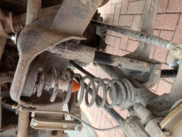 Current setup, or previous by the time I've written this :lol: new OE spec Supflex front springs with some of my old spring spacers on the top, and a RW machined bumpstop extension with a polyurethane bump stop... Note the curvature of the spring too, this is partly as I'm currently running SuperPro castor correction bushes but they are set to push the axle forward away from the bulkhead, so the front axle is probably 10mm further forward than it should be...