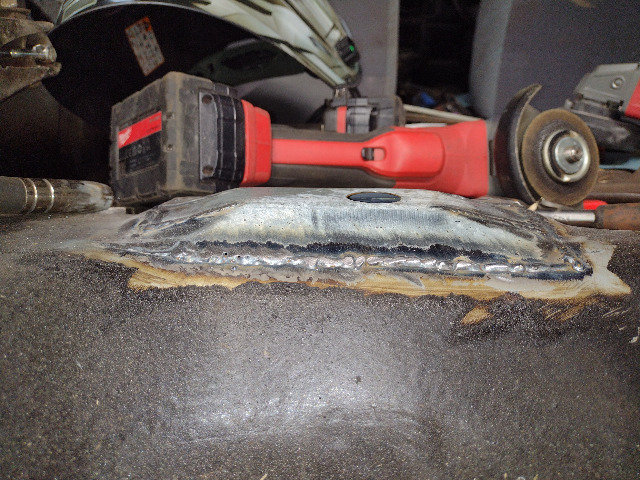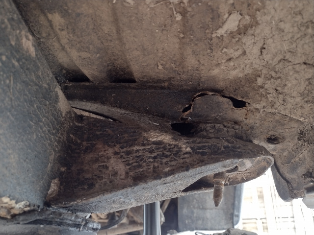 New mount goes in. I hammered a wooden wedge in between the body and chassis to lift the body back up to where it should be before welding in the mount.
