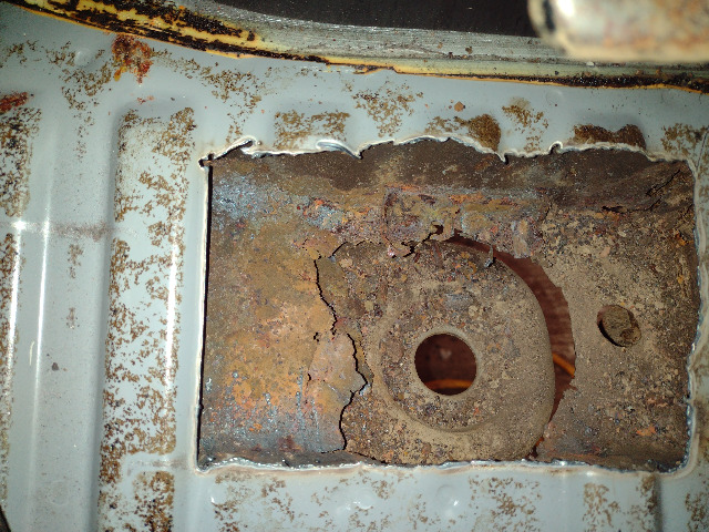 It was too warm to work on the Jimny over the summer but I'm finally back on it. When I left it I was just starting to dismantle it for final cleaning, painting and reassembly when I spotted this. I think all of the twisting I did while testing the suspension was the last straw for the body mount under the right hand footwell. Dammit, just as I think I have finished I find more rust!