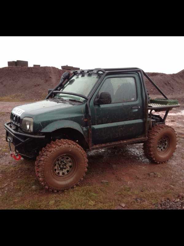 Big Jimny steering damper bracket. Disco Armstrong steering damper. 7X15 black modulars. 205/75/15 Maxxis 743 bravo m/t.Superpro camber correction bushes.Black A bar....